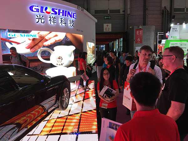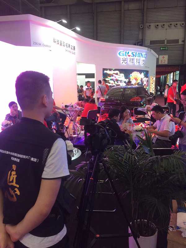 走進(jìn)光祥展位最吸引眼球的就是巨幕的地磚屏的展示。豪裝的屏搭配豪車(chē),不停下來(lái)多看幾眼都不行。