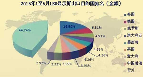 從對(duì)應(yīng)出口市場(chǎng)方面來(lái)看,美國(guó)、德國(guó)依舊是最大的出口目的國(guó),與2014年較為不同的是俄羅斯市場(chǎng)的變化。2014年1至5月,俄羅斯僅為中國(guó)的第八位目的出口國(guó),但是到了2015年,就已經(jīng)上升到了第三位的位置,貿(mào)易金額同比增長(zhǎng)52.33%,這種增長(zhǎng)速度幾乎到了令人驚嘆的地步。全球有超過(guò)160個(gè)國(guó)家從中國(guó)采購(gòu)LED顯示屏,俄羅斯在新興市場(chǎng)中表現(xiàn)最為搶眼。出口目的國(guó)的前十名分別為,美國(guó)、德國(guó)、俄羅斯、澳大利亞、墨西哥、英國(guó)、意大利、中國(guó)香港、荷蘭。其中,出口目的國(guó)為美國(guó)的企業(yè)達(dá)54家,出口目的國(guó)為德國(guó)的企業(yè)有30家,出口至俄羅斯的企業(yè)有26家。根據(jù)海關(guān)數(shù)據(jù)統(tǒng)計(jì),成交金額達(dá)到千萬(wàn)美金的企業(yè)共有五家: