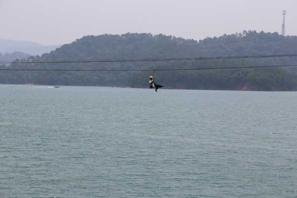“哇”隨著大家的驚呼,我們順著眾人的目光看去。只見小王身上綁著保險帶,已經(jīng)溜到了江心。遠遠看去,人在半空中,像只小鳥似的,遠遠的只看到一頂黃顏色的帽子分外顯眼,底下是水流湍急的江水。只見人在不斷地滑動,大家都為他捏把汗。慢慢地,慢慢地,時間似乎在那一刻凝固了。大伙都屏住呼吸,靜靜地望著小王的身影……終于,小王平安地滑到了岸邊,人群中曝出一陣掌聲,大家歡作一團。
