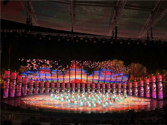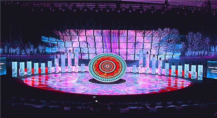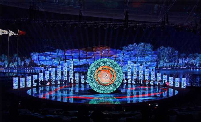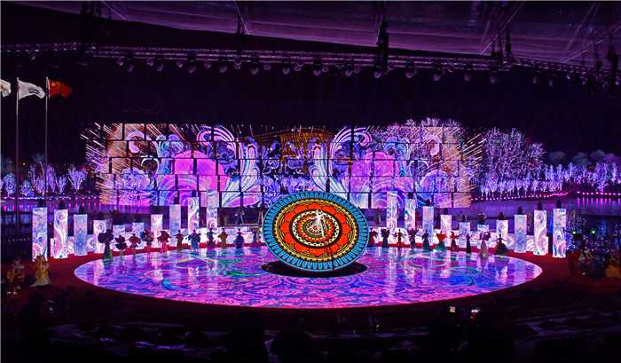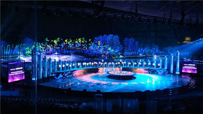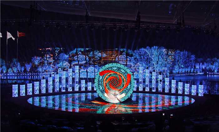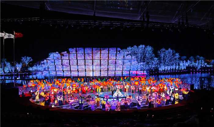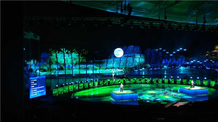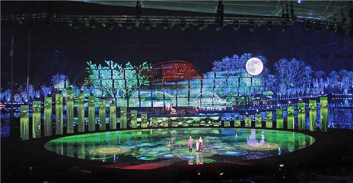 北京嘉明偉視國際會展有限公司承擔(dān)了此次2019年北京世界圓藝博覽會開幕式主舞臺和備用場地的所有LED的制作、施工、調(diào)試和播控工作。而本次文藝演出的所有顯示屏都來自于深圳市光祥科技股份有限公司,覆蓋了多樣化的舞臺異形屏,曲面屏,透明屏等定制顯示屏。其中1900平方米的網(wǎng)幕屏在舞臺南側(cè)的湖面上空,其擁有高亮防水,結(jié)構(gòu)靈活,抗風(fēng)等級高,再依托于威亞吊裝系統(tǒng),結(jié)合編程組合、穿插調(diào)度,將畫面和湖面的倒影呈現(xiàn)出別樣的生動(dòng)。尤其是特制的直徑8米圓形網(wǎng)幕屏能上下左右移動(dòng),湖水當(dāng)空,和潤圓月,美輪美奐。