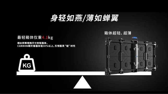 Carbon系列外觀精簡,將輕薄進行到底。主材采用新興輕量化碳纖維材質,最輕重量僅4.1KG。相比同等規(guī)格尺寸的鋁箱體,Carbon碳纖維箱體輕30%以上,引領租賃“輕”時代。Carbon系列身輕如燕、薄如蟬翼的特質,在LED顯示屏實際搭建過程中,大幅節(jié)省人力時間成本。