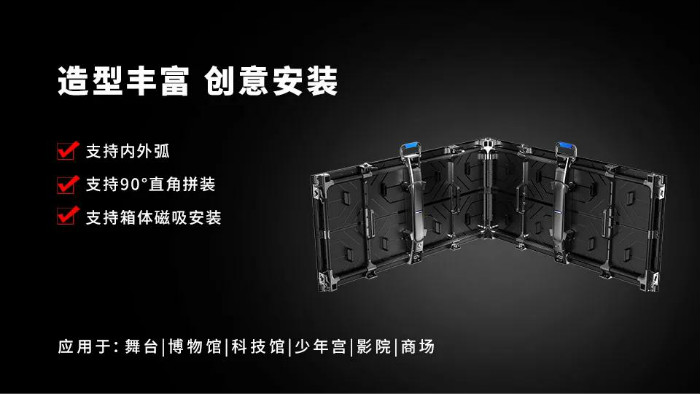 租賃屏的魅力在于所呈現(xiàn)的創(chuàng)意style。Carbon系列能實現(xiàn)諸多舞美造型,支持內外弧、90°拼裝,且又新增快捷磁吸安裝,提升人工作業(yè)效率。產(chǎn)品有著廣泛運用前景,搭配專業(yè)技術方案,能千變萬化于舞臺、博物館、科技館、少年宮、影院、商場等不同空間領域。