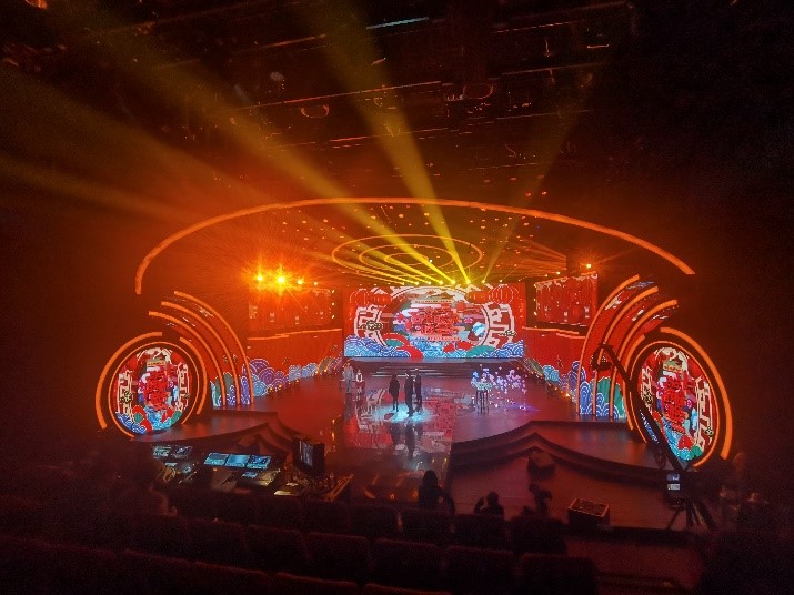 此次舞臺使用千余平光祥科技LED顯示大屏,以“宮燈”為基礎(chǔ)造型,整個舞臺由多個“宮燈”組成。主屏幕雙屏幕設(shè)計呼應(yīng)“開門迎福氣”主旨,兩側(cè)4個“宮燈”造型的旋轉(zhuǎn)舞臺,讓演出效果更加豐富。天花板有5個內(nèi)嵌組燈的六邊形造型屏幕,與光束結(jié)合時可以呈現(xiàn)虛幻的宮燈輪廓效果,與虛擬視效結(jié)合時可以打造出真實立體感的旋轉(zhuǎn)宮燈!
