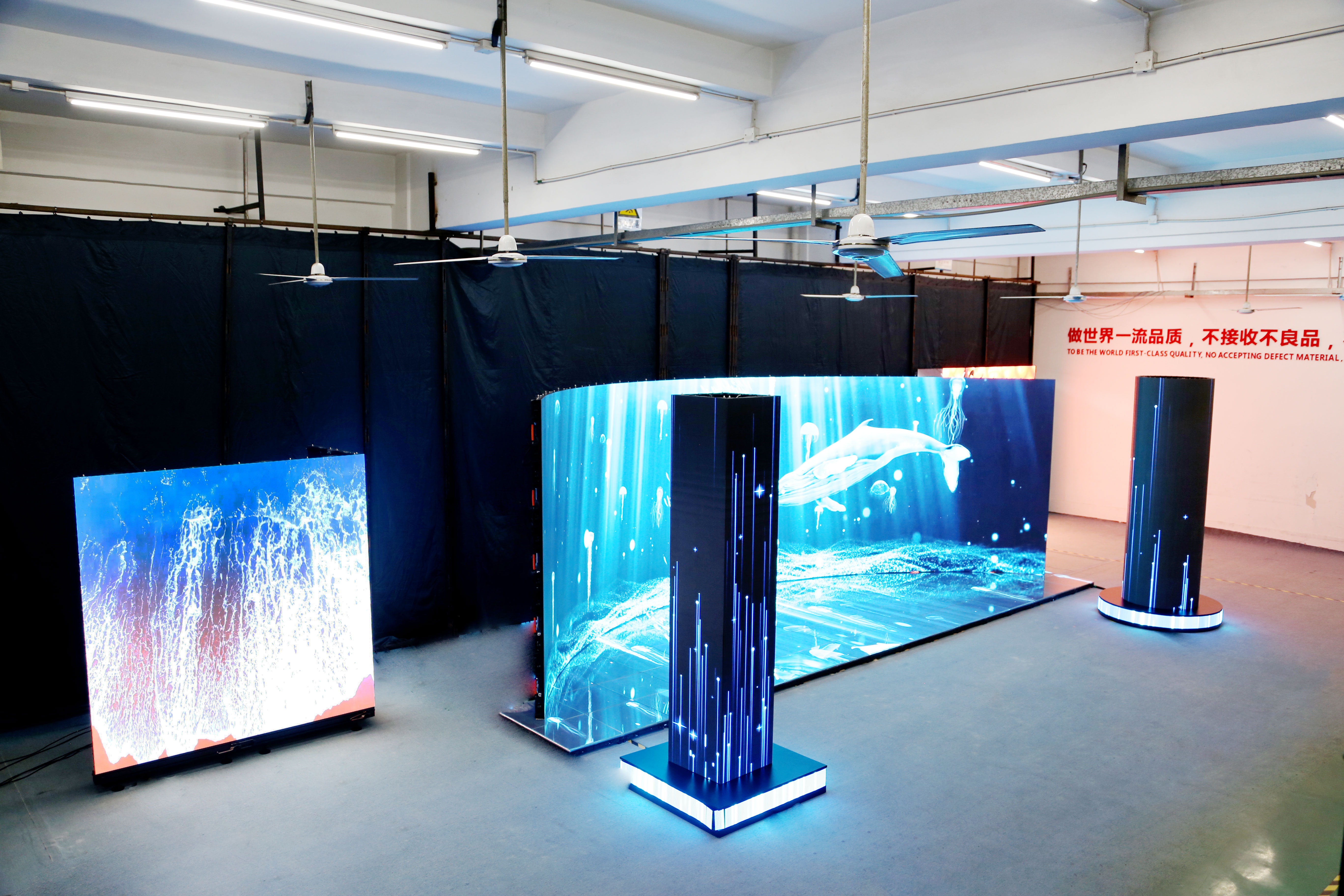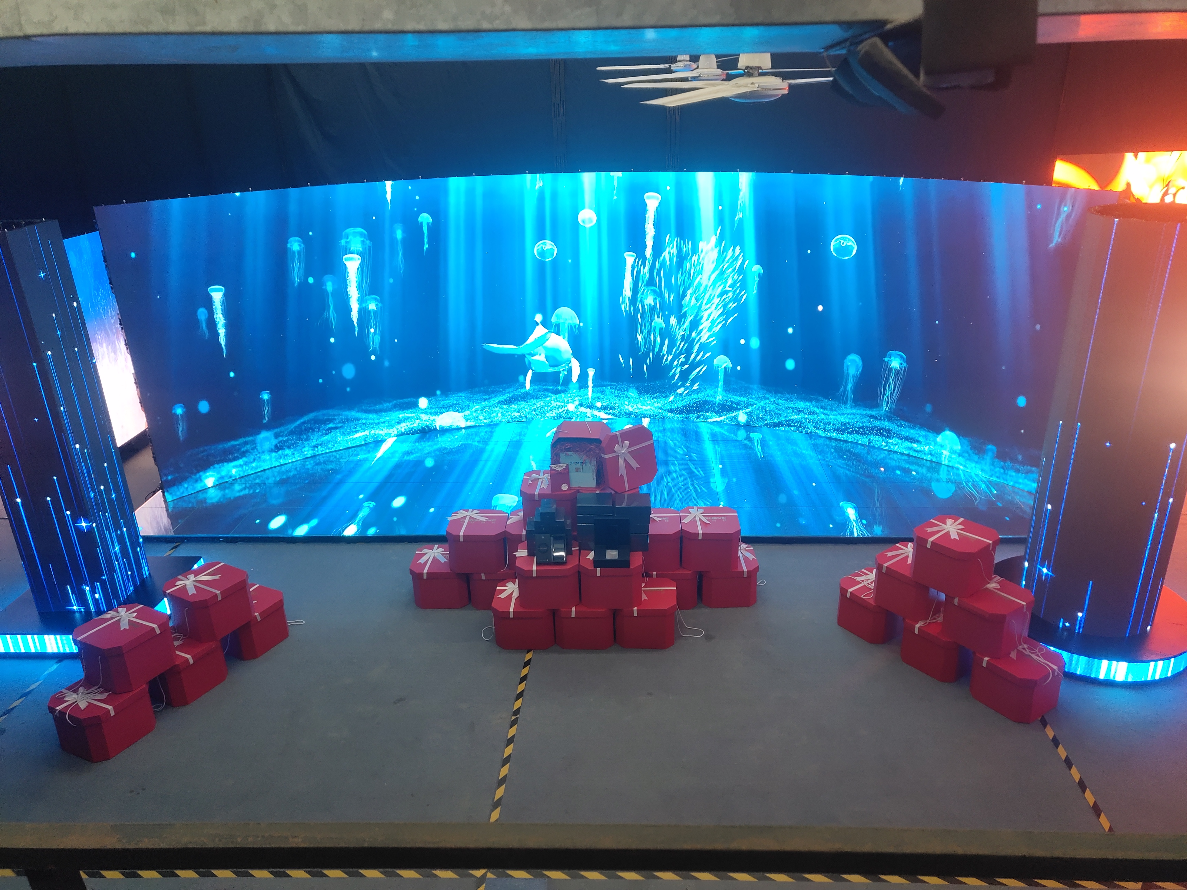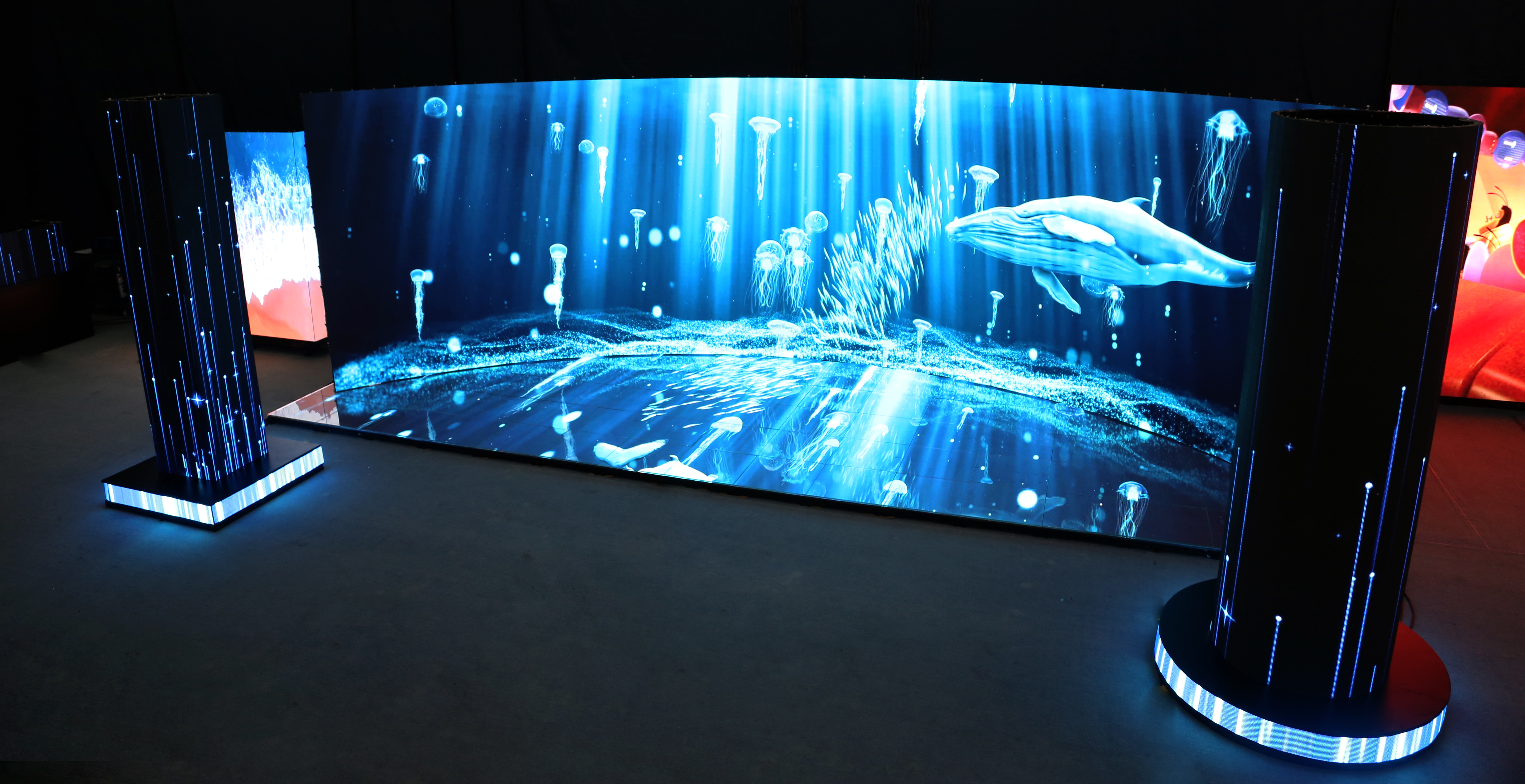 展覽場(chǎng)地搭建的XR沉浸式虛擬場(chǎng)景,使用的是PL2.6系列和CL2.6系列。PL2.6系列是光祥全新推出的一款室內(nèi)LED顯示產(chǎn)品,可做常規(guī)拼接、直角拼接、立體拼接、弧形拼接以及與圓柱屏CL系列互拼。