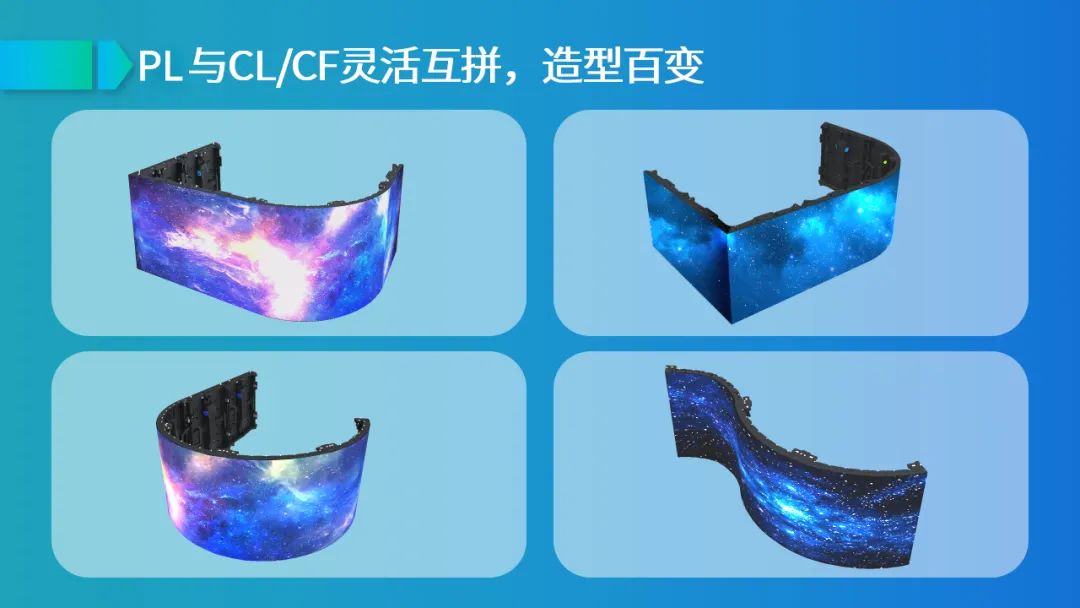 光祥PL+CF系列是“常規(guī)顯示屏+異形顯示屏”的創(chuàng)新結(jié)合,自推出就收到好評不斷。打破常規(guī)顯示屏的限制,可做與眾不同的拼接造型,滿足各類場景下的不同需求。