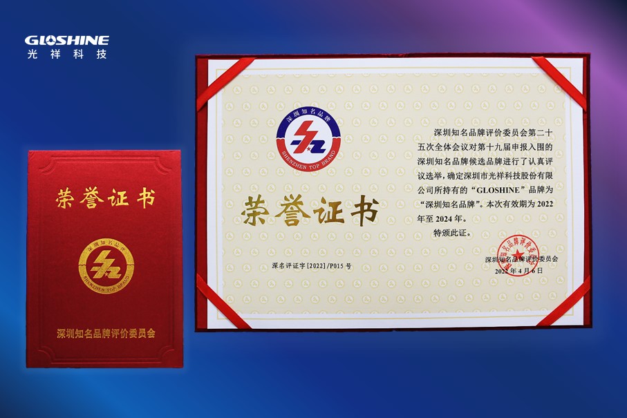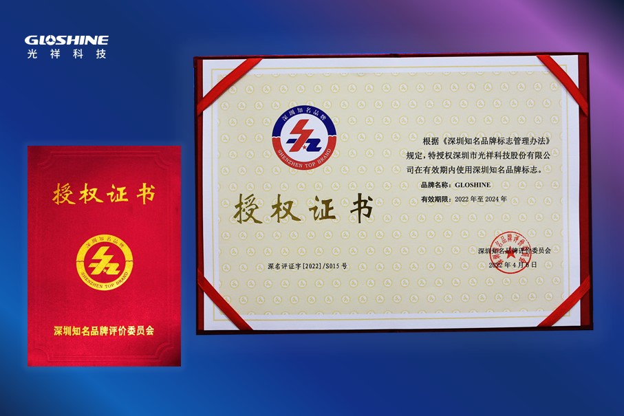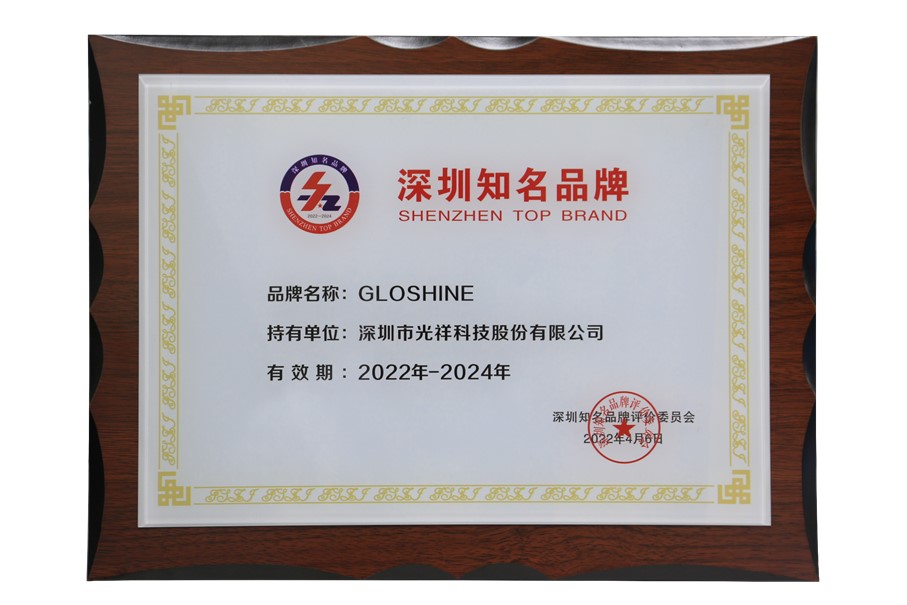 2022年8月24日,在由深圳知名品牌評(píng)價(jià)委員會(huì)主辦的“深圳工業(yè)總會(huì)成立二十周年成果發(fā)布會(huì)”上,深圳市光祥科技股份有限公司GLOSHINE被授予 “深圳知名品牌”榮譽(yù)稱號(hào),成為我市893個(gè)“深圳知名品牌”之一,僅占全市企業(yè)總數(shù)的萬(wàn)分之四。
