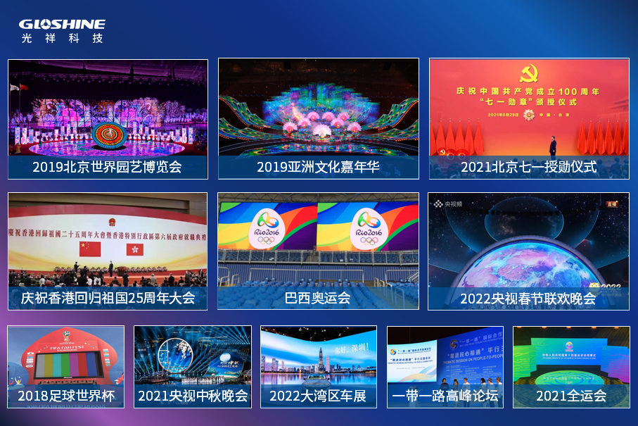 光祥GLOSHINE品牌LED顯示屏是眾多重大會(huì)議、論壇、晚會(huì)、展會(huì)、文體賽事的首選顯示屏,如應(yīng)用于建黨100周年“七一勛章”頒授儀式、慶祝香港回歸祖國(guó)25周年大會(huì)暨香港特別行政區(qū)第六屆政府就職典禮、北京“一帶一路”國(guó)際合作高峰論壇、巴西奧運(yùn)會(huì)、俄羅斯世界杯、亞洲文化嘉年華、北京世界園藝博覽會(huì)等,并連續(xù)多年應(yīng)用于央視春晚及各大節(jié)慶晚會(huì)、四大車展。
