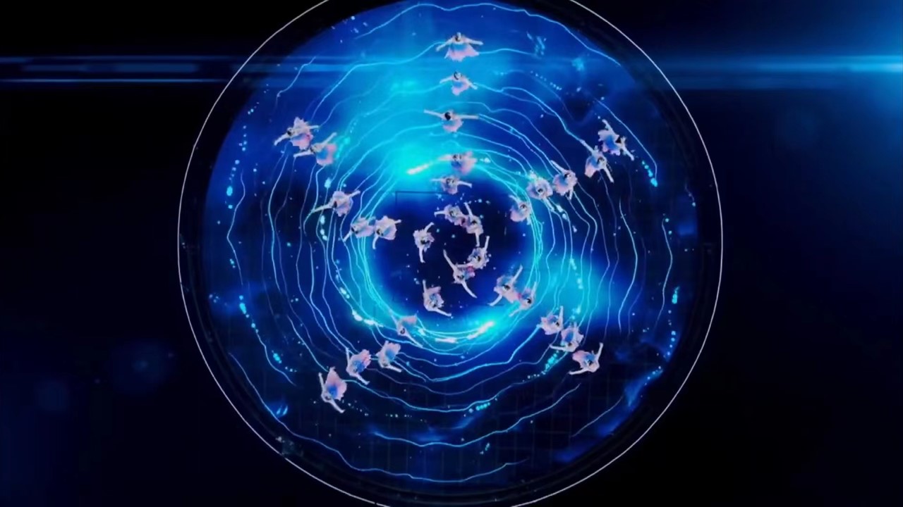 鏡頭隨時光流轉(zhuǎn),升至上空落在舞臺中央正上方,演員的身姿,伴隨著音樂和地上的光影起舞、旋轉(zhuǎn)。似在銀河里,沉醉地飛翔,漫游星空。