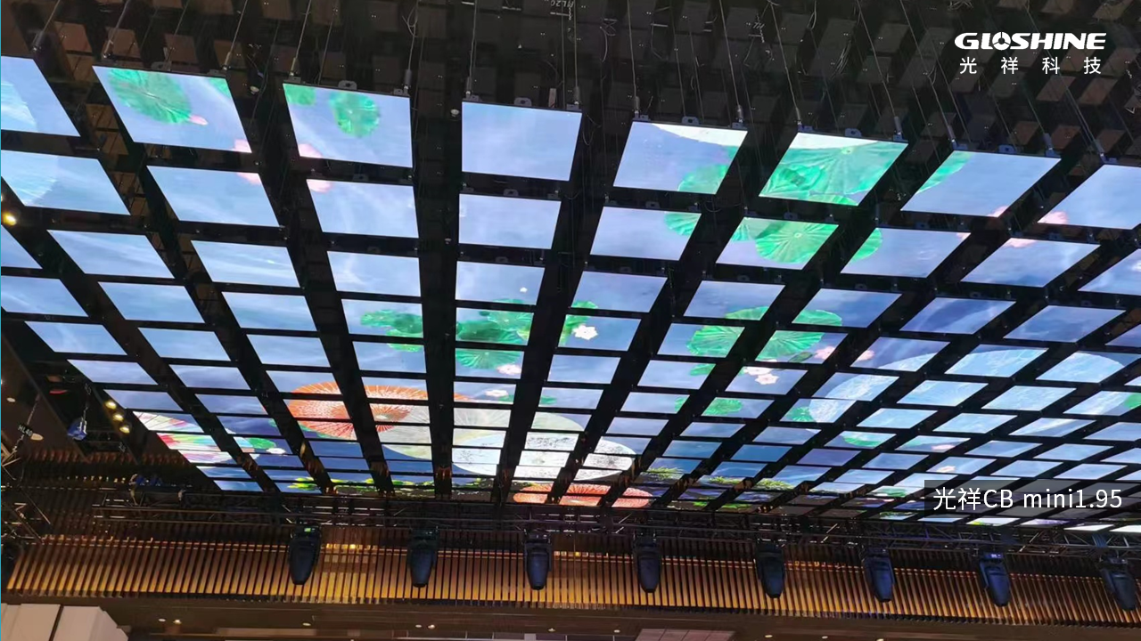 動(dòng)態(tài)雕塑屏懸掛于1號(hào)多功能廳的上空中心區(qū)域,216塊500mm×500mm的光祥CB mini 1.95小間距高清屏以12排×18列排列,每?jī)蓧K屏體之間的距離僅為220mm。