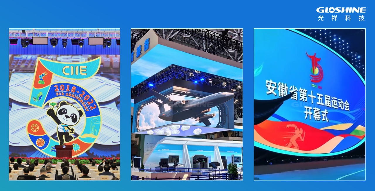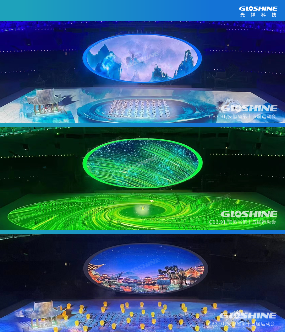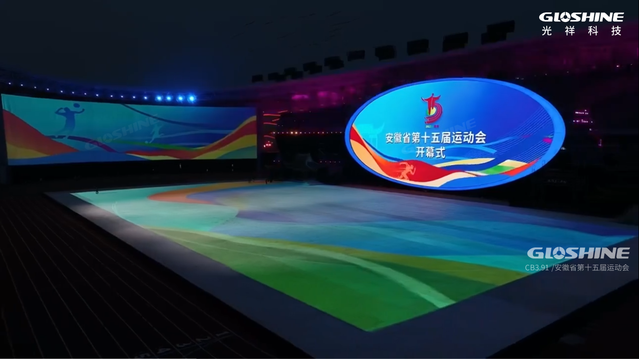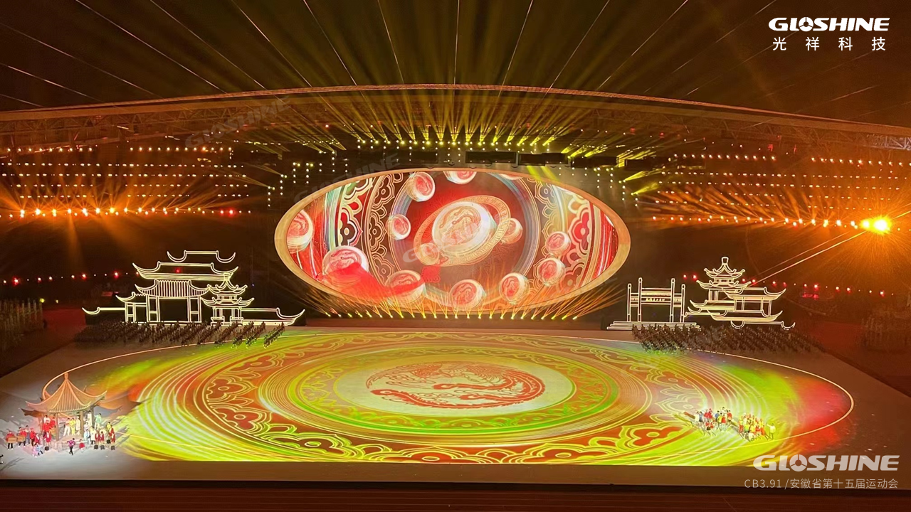 本屆安徽省運會開幕式演出分為序、光華耀江淮、夢想映未來、舞動精彩四部分,1200平米的光祥CB系列高清屏與地面舞臺、移動亭橋立體結構、全景投影技術,形成地面、空中、舞臺的三維立體互動。