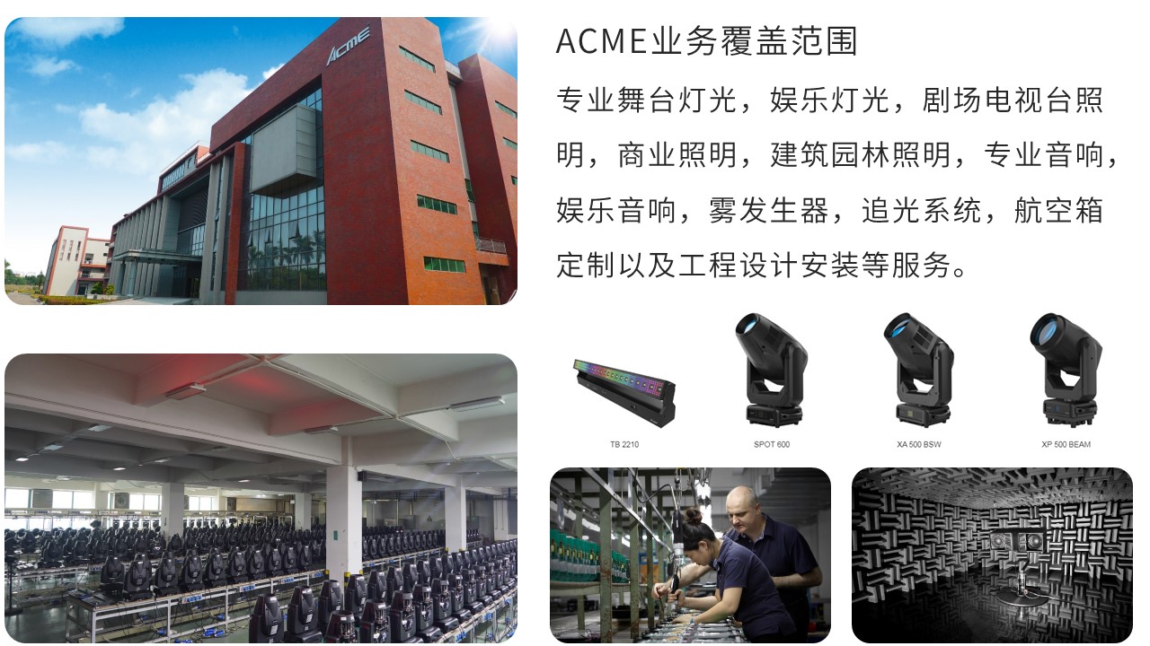 ACME成立于1985年,總部坐落于佛山市高明區(qū)"國家火炬計(jì)劃佛山新材料產(chǎn)品基地",擁有100余畝標(biāo)準(zhǔn)化現(xiàn)代廠房。公司集研發(fā),生產(chǎn),行銷于一體,歷經(jīng)30多年高速發(fā)展,ACME憑著卓越的產(chǎn)品和走在行業(yè)前沿的創(chuàng)新技術(shù),已經(jīng)成為全世界規(guī)模最大的娛樂和舞臺照明制造商之一。