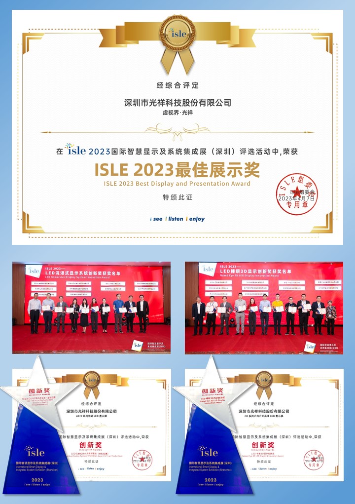 4月9日,為期三天的2023國際智慧顯示及系統(tǒng)集成展(簡稱“ISLE 2023”)圓滿閉幕,光祥科技“虛視界·光祥”視覺秀完美收官。三天累計(jì)吸引超過萬人觀看,成為上周末深圳國展中心網(wǎng)紅打卡點(diǎn),并榮獲“ISLE 2023最佳展示獎(jiǎng)”。