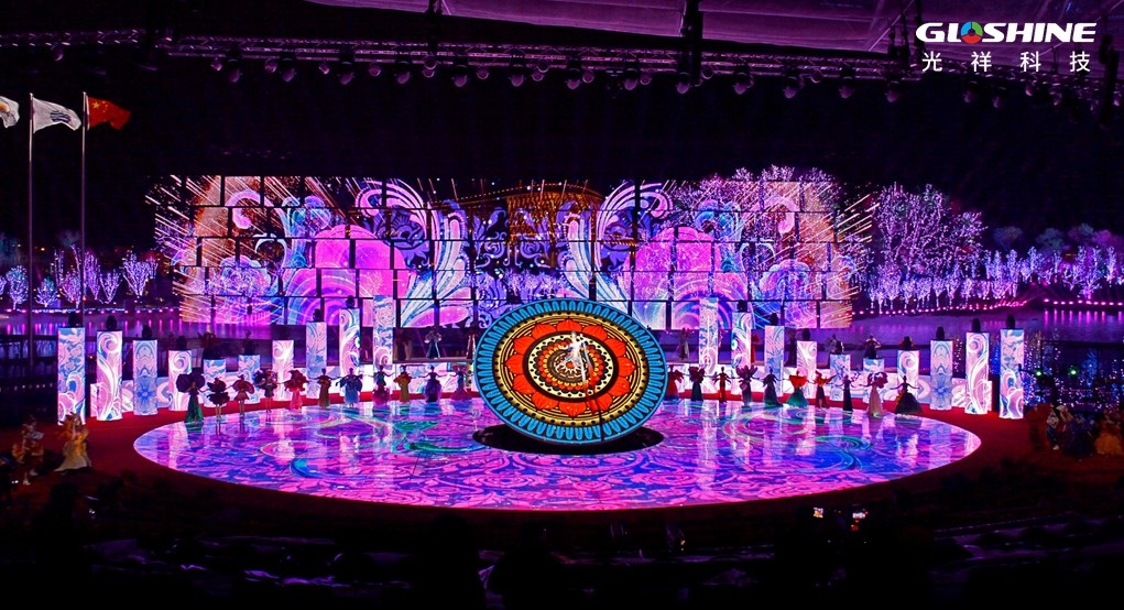 2019年4月28日,中國北京世界園藝博覽會開幕式在北京世園公園演藝中心隆重舉行,光祥科技應(yīng)用3000平方米的LED顯示屏,在湖光山色間打造大型光影藝術(shù)表演舞臺。首創(chuàng)升轉(zhuǎn)異形地屏、舞臺升降圓柱屏等,是迄今為止全國大型演出舞臺LED異形顯示屏應(yīng)用最多的項目。