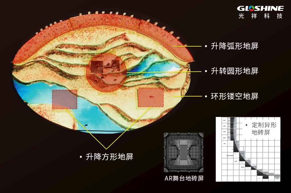 主舞臺是直徑38米乘25米、面積近800平方米的橢圓形地屏,由形狀各異的定制異形地屏拼接而成。定制異形地屏是整個舞臺造型的關(guān)鍵,它組成了舞臺中央升轉(zhuǎn)圓形地屏、環(huán)形鏤空地屏、三座升降弧形地屏的交接邊緣,由AR系列舞臺地磚屏根據(jù)舞臺實際需求進行定制,面積共計400平方米,箱體種類260種。