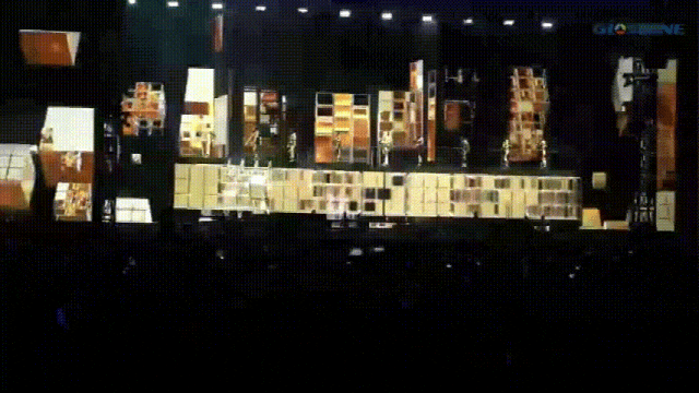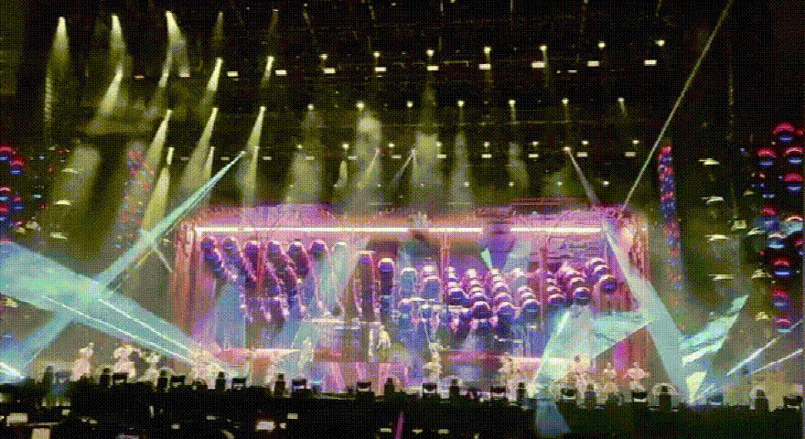 宏偉炫酷的舞臺位于寶體主場西面跑道,從居中的主屏幕到左右條形屏幕、兩側(cè)大屏,分別矗立于舞臺上方邊緣和兩側(cè),而主屏幕前方則是如風(fēng)車輪轉(zhuǎn)的可移動條形屏幕。與歌舞隨行,變動炫麗耀眼又不刺眼的華美色彩。