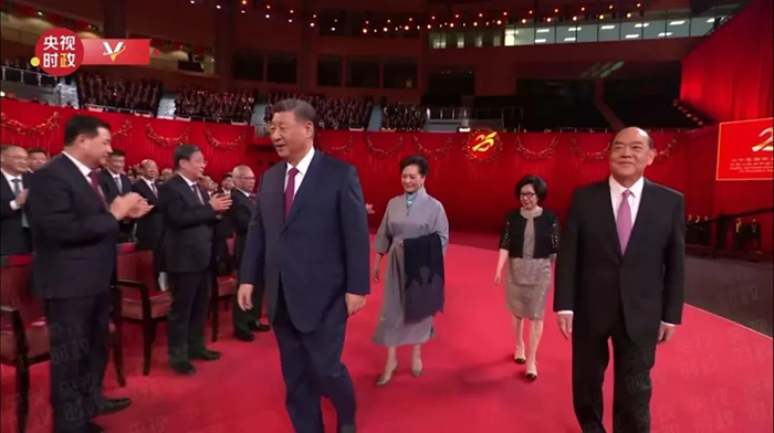 習(xí)近平和夫人彭麗媛在澳門特別行政區(qū)行政長(zhǎng)官賀一誠(chéng)和夫人鄭素貞陪同下步入現(xiàn)場(chǎng),全場(chǎng)起立,鼓掌歡迎。